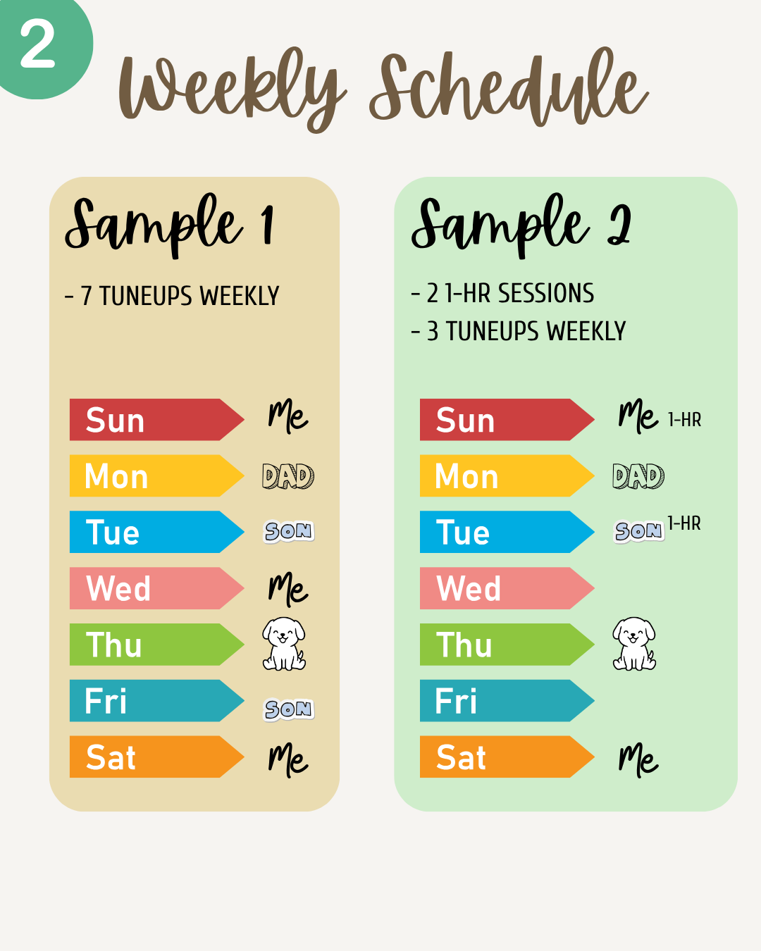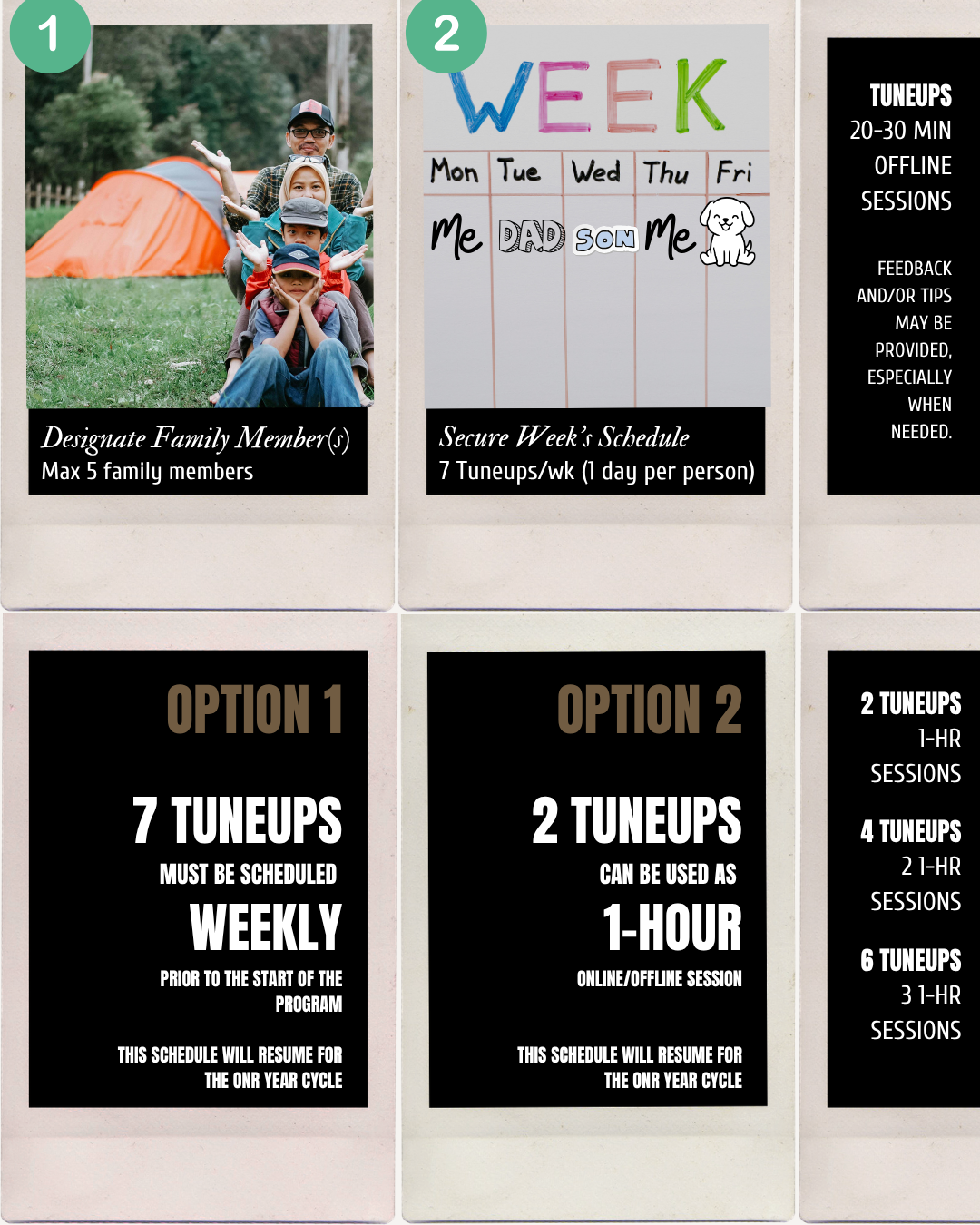 Choose your weekly schedule for the year. The schedule should remain for the next 365 days. You have the option for 7 tuneups per week or let 2 tuneups become a one 1-hour session. All tuneups are offline and 1-hr sessions can be online or offline.